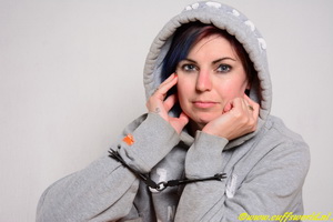 For the last set with Ingrid today,we give her a grey hoodie, it was a little to large for her, but that is what we like. She came barefoot out the dressroom and we are waiting with an old set of chainlink handcuffs of the Russian federation and cuffed her as wel in the front as at the back