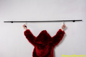 We give our blond model Christy a red oversized fur coat with a very large hood, it looks